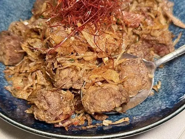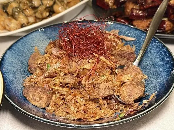 另一道深受老饕喜愛的招牌菜是「油條蒜蓉鮮蚵」,這道菜完美呈現了海鮮的新鮮度,蚵仔保持著最肥美的狀態,粒粒飽滿且帶著濃郁海味,完全沒有任何腥味,最厲害的是,連搭配的油條都處理得有滋有味,香脆爽脆,吸附了蒜蓉醬汁的油條讓口感層次更加豐富,讓這道菜成為名符其實的下飯好菜,而「寶島米粉」也是富錦樹台菜的招牌菜之一,米粉柔中帶韌,Q彈不爛,充分吸附了豐富的湯汁和配料,整體風味鮮香鹹中帶甘,這就是台灣人難忘的經典家常味,如果想要更上層樓,可以搭配店家提供的辣油,為米粉增添香氣與風味,不過,有顧客反應在101店品嚐「嫩煎骰子牛」時,覺得牛肉做老了,可能火候與熟度的掌握不如敦北店,顯示即使是頂級餐廳,餐點品質也可能因為分店或主廚而有所不同。