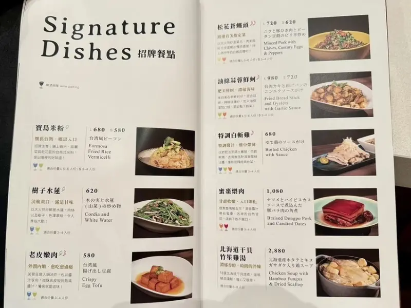 富錦樹台菜香檳不僅注重硬體設計,更將服務細節推向極致,為了呼應法式飲食節奏的概念,店家特別與冠軍侍酒師Thomas Ho攜手合作,為顧客提供最強的Wine Pairing(侍酒搭配)服務,讓台式料理不再只有啤酒或茶飲的選擇,而是可以搭配優雅的法國香檳或頂級葡萄酒,這種創新的組合,讓傳統台菜的風味層次更加豐富,顧客在點餐時,除了可以選擇單點招牌菜色,也可以參考店家提供的合菜方案,例如3990元的4人合菜或是7990元的8人合菜,第一次造訪的顧客,可以從招牌餐點點起,例如老皮嫩肉、松花蒼蠅頭等都是不踩雷的經典,但部分人氣菜色例如佛跳牆、紅蟳米糕、香辣螃蟹和鯧魚米粉則需要提前3日預訂。