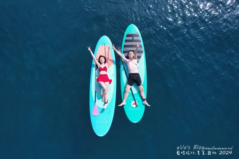 最後教練還出動 空拍機 幫我們拍照,從高空視角拍下整片湛藍海面與 SUP 板的畫面真的超壯觀!不過要記得一個小重點——擺拍的動作一定要大一點,這樣空拍照片才會更明顯、構圖也更好看
