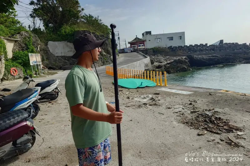 我們參加的是早上 08:00 的第一梯次SUP 立槳活動,這個時段相對清幽,整場體驗只有我們兩個人加上一位教練,教練騎著機車帶領我們前往位於 大福漁港附近的大福亭天然泳池,這裡水質清澈、環境安靜,非常適合初學者練習與拍照
