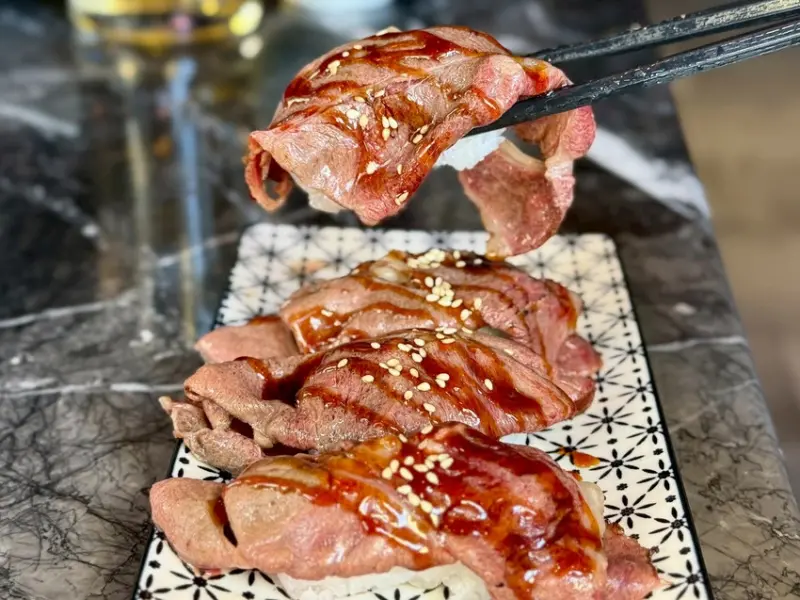 限量供應的霜降牛炙燒壽司也是必點的項目之一,淋上醬汁以後吃起來鹹鹹甜甜好開胃