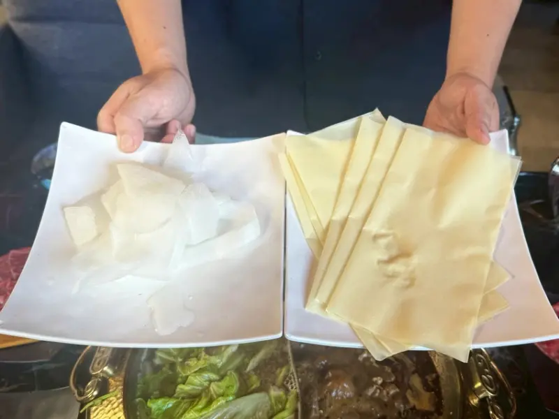 點了我覺得特別的蘿蔔捲和每日限量豆腐紙,豆腐紙是豆腐經由高溫壓製成 ,看起來真的就像紙一般,輕薄可透光,下鍋涮3-4秒即可食用 ,搭配魷魚螺肉蒜湯,吸附滿滿魷魚螺肉湯汁超美味