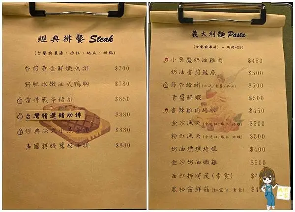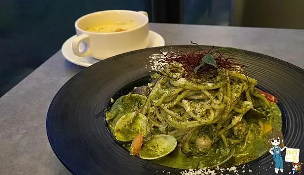 這裡的餐點同樣不馬虎,新推出的「豬肋排套餐」,豬肋排燉煮得軟嫩入味,香氣十足,搭配清爽的沙拉、地瓜與餐後甜點仙草凍,套餐完整度高。「青醬蛤蜊義大利麵」的青醬風味非常濃郁,蛤蜊也相當鮮甜,麵條口感彈牙。而「小惡魔雞肉燉飯」雖標示不辣,但仍帶有黑胡椒的香氣,風味層次豐富。此外,炸物三拼中的「馬茲瑞拉起司條」更是桌桌必點,浮誇的牽絲長度總能引起此起彼落的笑聲。