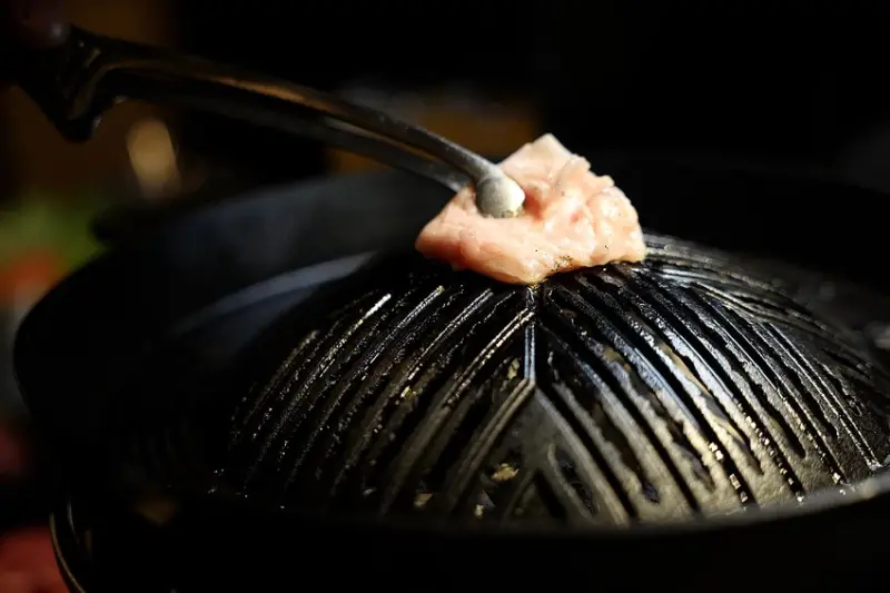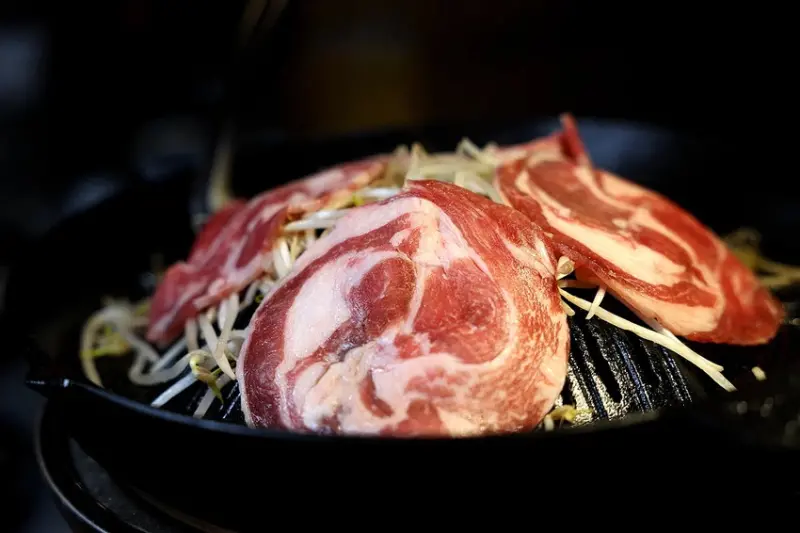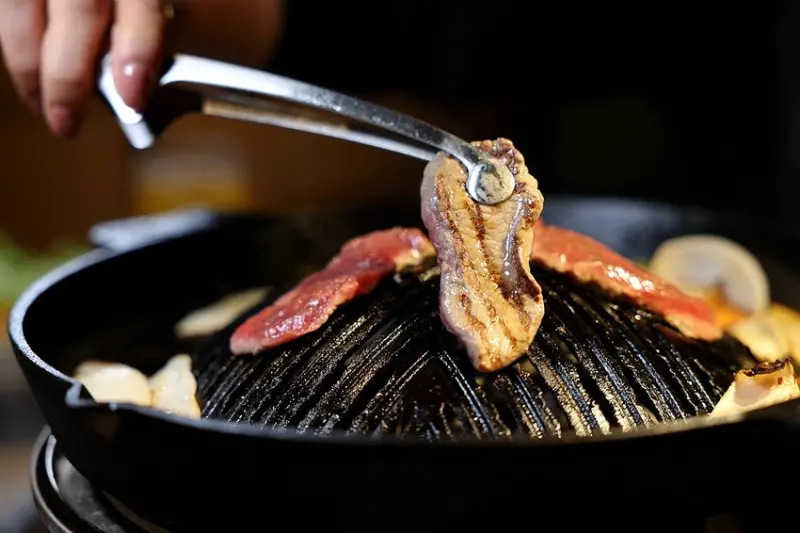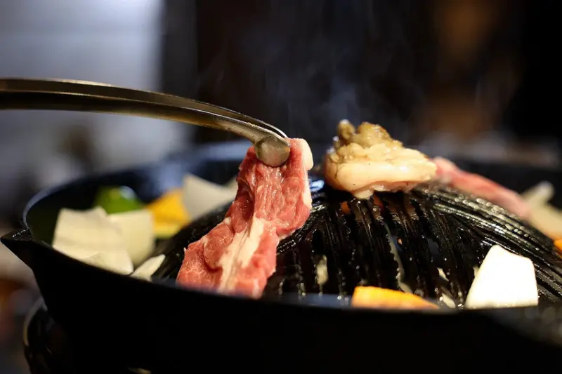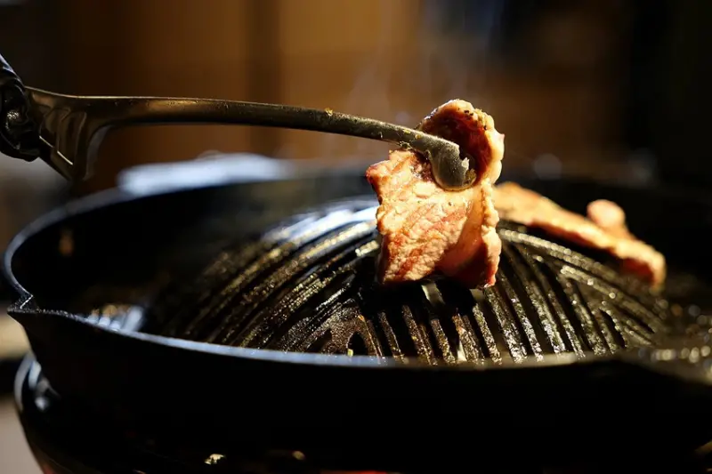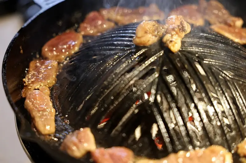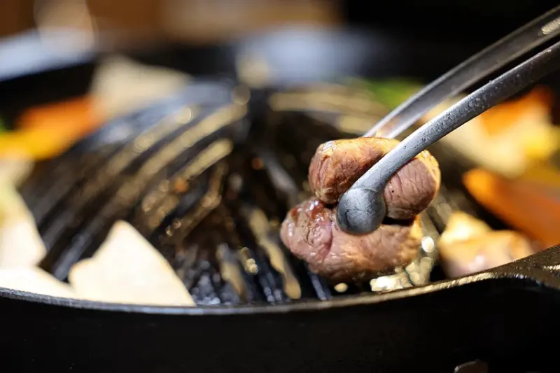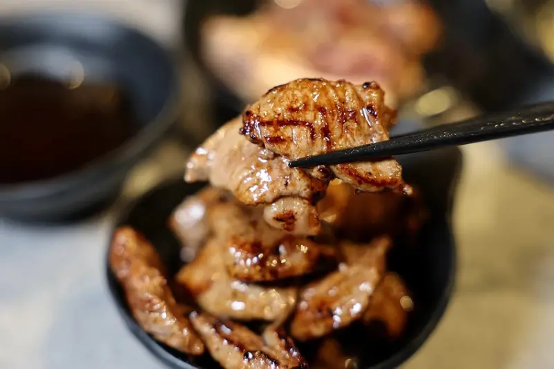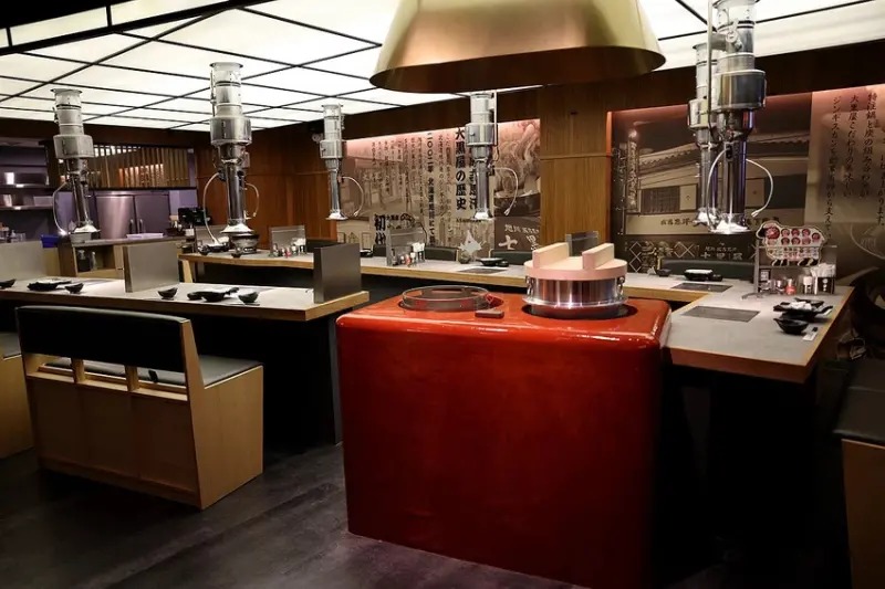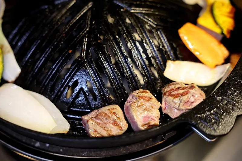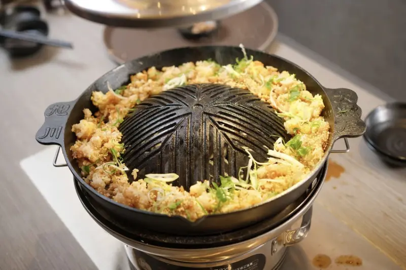 「大黑屋」的成功不僅在於肉品,更在於對所有細節的極致堅持,一樓入口處的展示牆,便陳列著象徵品牌靈魂的鑄鐵鍋、竹炭與特製醬料。店內使用的白米,是從日本北海道直送的優質糙米,堅持每日在店內新鮮研磨,並以傳統鍋釜當天現煮,確保米飯的香氣與甜度都維持在巔峰狀態。烤爐上那座中央隆起的特製山形鑄鐵鍋,更是來自擁有超過80年歷史的「岩見澤鑄物株式會社」,其高導熱性與耐磨特質,能瞬間鎖住肉汁,搭配火力穩定、煙氣少的竹炭,完整帶出羊肉的鮮甜。