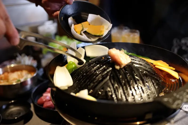來到「大黑屋」,即便是初次品嚐成吉思汗烤肉也不用擔心,第一份肉品上桌時,店內專業的服務人員都會親自示範,並細心解說最佳的燒烤方式。開烤前的儀式感十足,服務人員會先放上一塊「靈魂羊油」,在炙熱的鑄鐵鍋上滋滋作響,隨著羊油融化滲入紋路,濃郁香氣瞬間爆發。接著將綜合蔬菜鋪滿鍋邊凹槽,讓蔬菜在慢火中釋放甜味,同時吸收從上方滴落的精華肉汁,這才是最道地的成吉思汗時間。