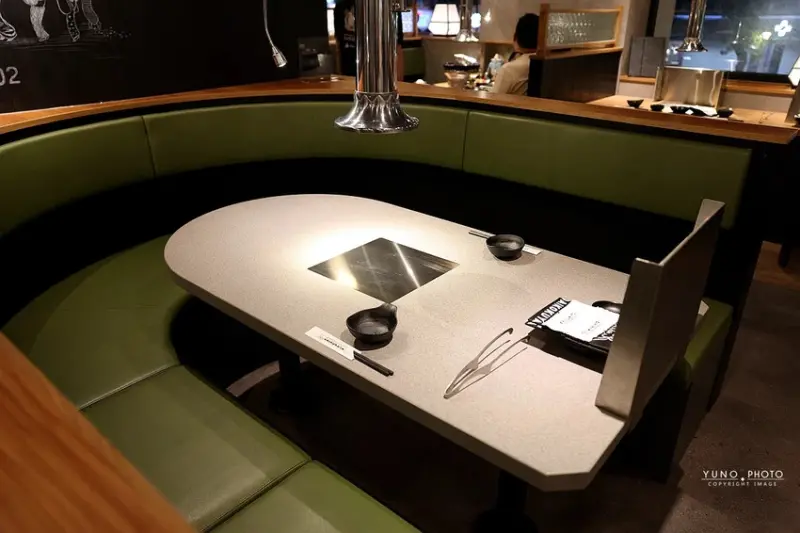二樓的用餐空間則轉為更靜謐雅緻的氛圍,同樣設有單人及雙人座位,並規劃了適合4至6人聚餐的半圓形沙發區,以及可容納多人的半開放式包廂,無論是情侶約會、家庭用餐或公司聚會,都能找到最合適的角落。最貼心的是,每個座位均配置了獨立的烤爐與排煙系統,讓顧客在享受炭火香氣的同時,也能保持空氣清新,安心享受熱氣騰騰的烤肉饗宴。