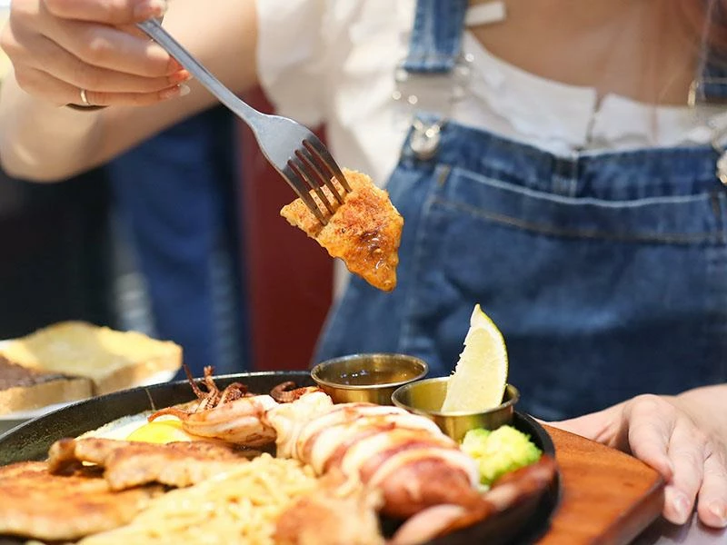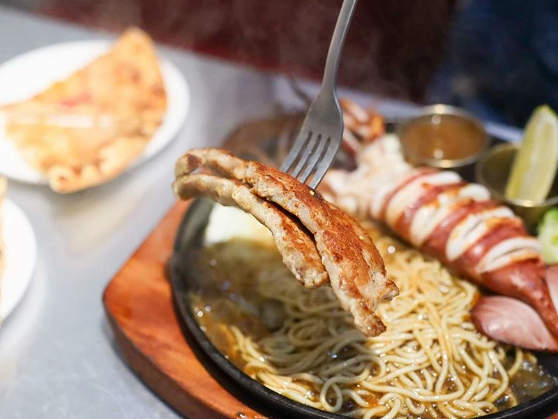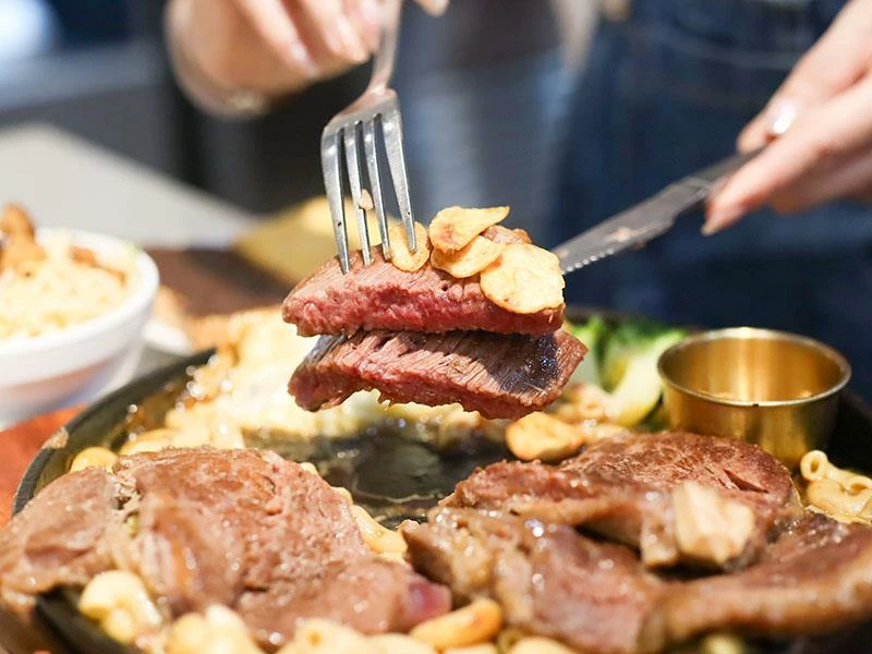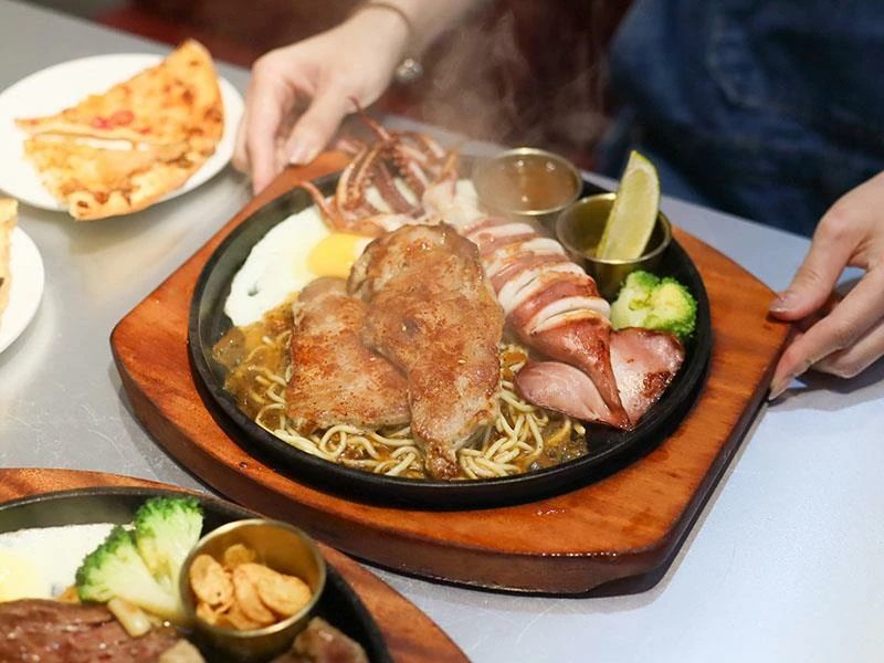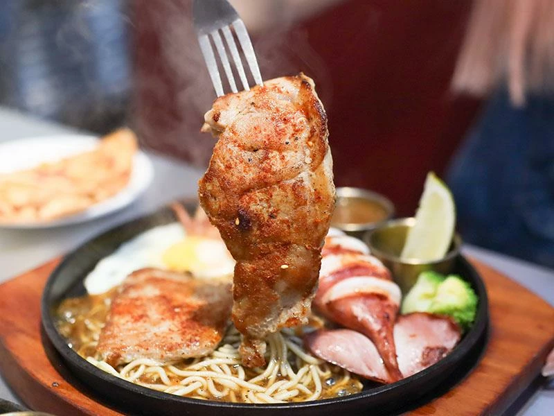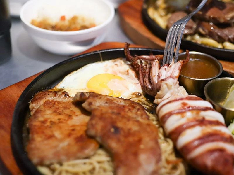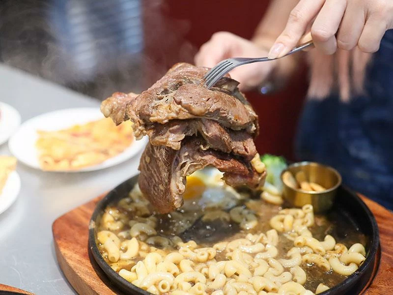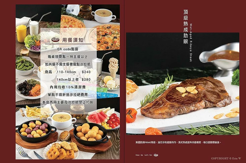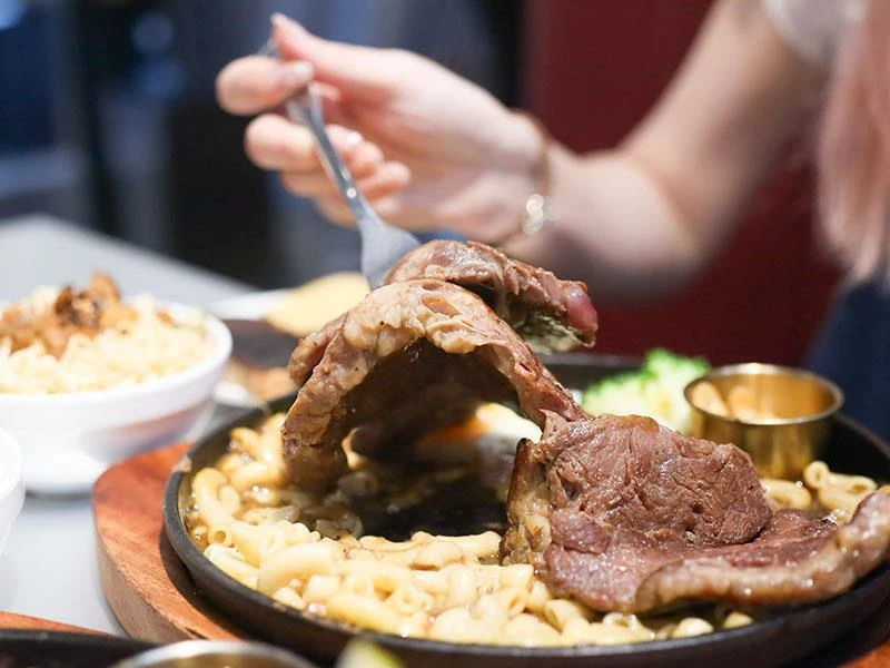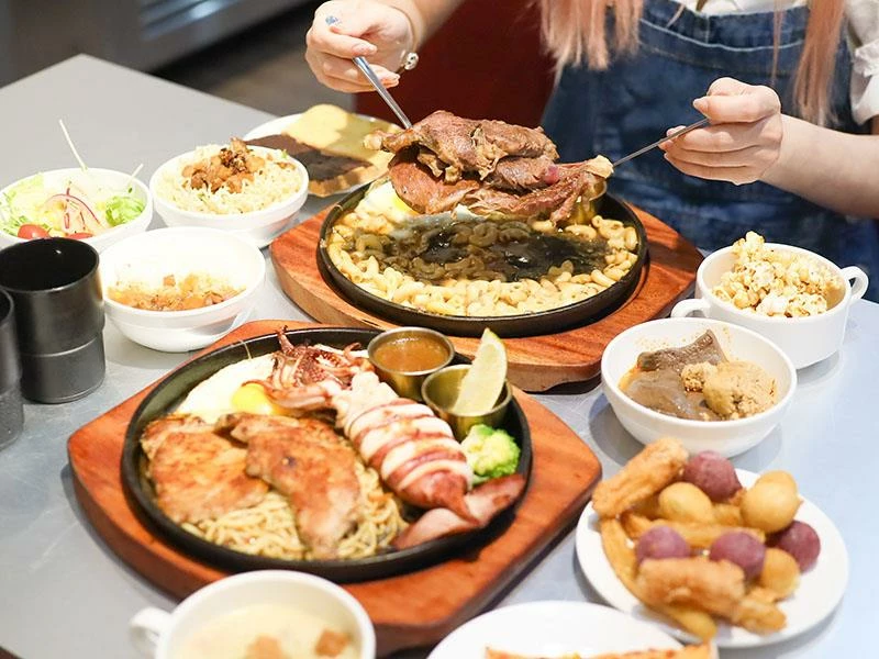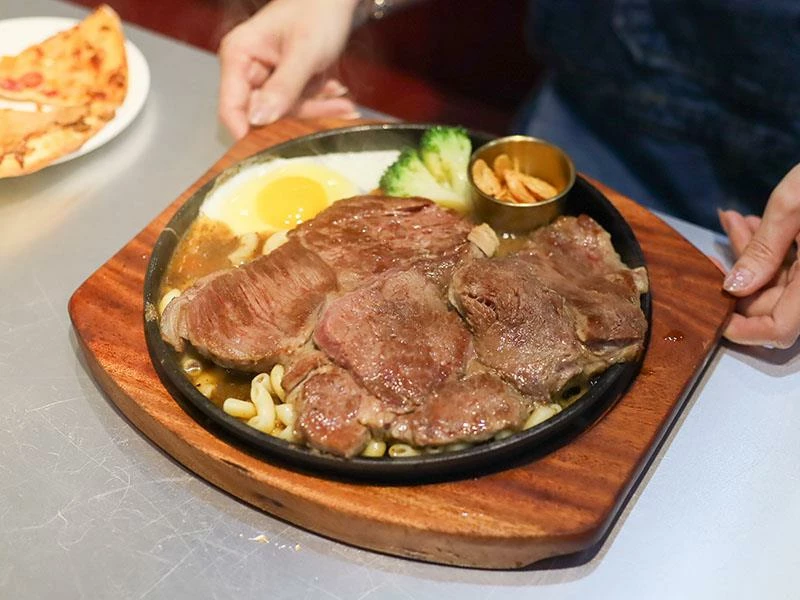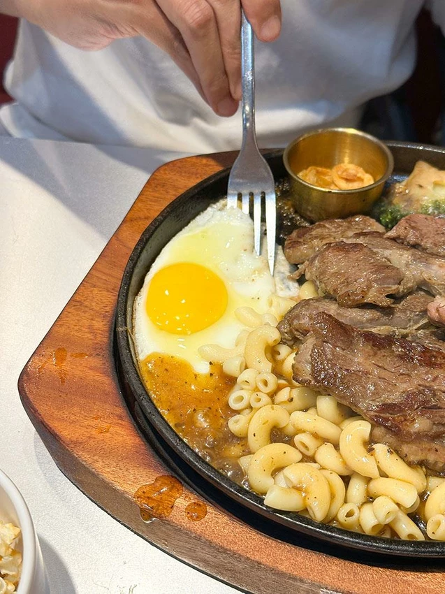 雖然自助吧的內容已經非常吸引人,但牛排的主餐依然是牧樂牛排的重點。店內的主餐價格最低從319元起跳,就能享用主食和豐富的自助吧。菜單上最誇張的MAX等級是12盎司巨牛排,價格只要499元,整塊牛排幾乎把鐵盤遮滿,份量十足。如果想要吃得更豐盛,顧客還可以加點中卷一同享用。在麵的種類方面,顧客可以選擇油麵、烏龍麵和通心麵等,選擇非常多元化。每份主餐都會附上一顆蛋,在熱騰騰的鐵板上翻蛋的動作,搭配滋滋作響的聲音與半熟的蛋黃,增添了一份吃平價牛排的儀式感。