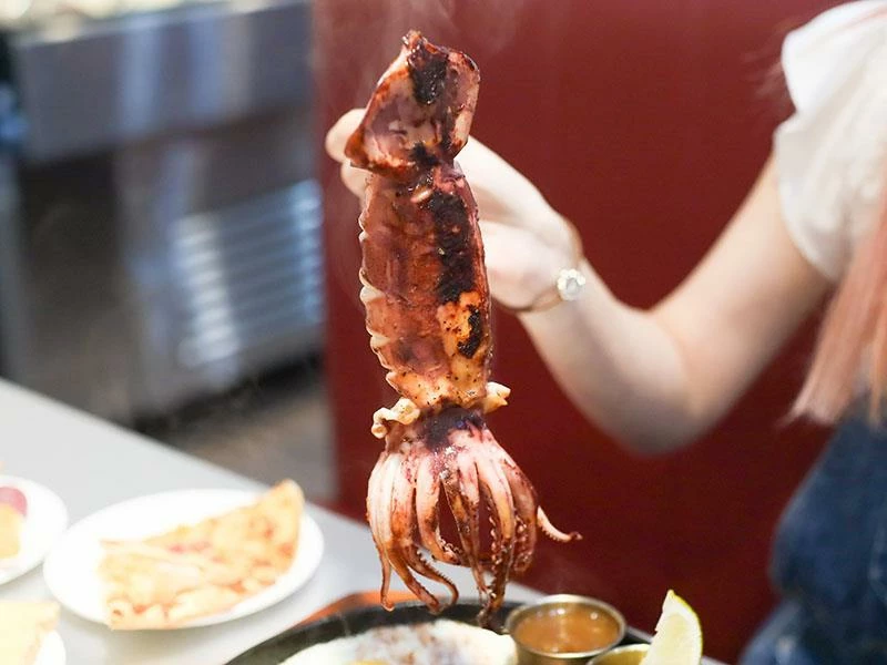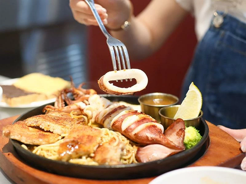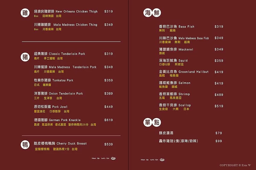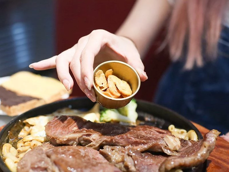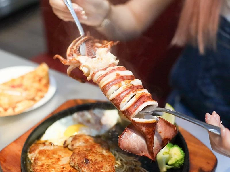 MAX巨牛排建議選擇五分熟的熟度,這樣能正好保留牛肉的嫩度,切下時可以看到肉汁滲出,筋與肉交織的部分在口感上多了韌性,越嚼越能感受到牛肉的鮮甜。牛排會附上脆脆的蒜片,搭配一起享用非常美味。另外,川辣豬排也是值得嘗試的選項,價格為349元。豬排有事先醃過,肉質帶有厚實的香氣,表面撒上店家特調的川味辣粉。第一口咬下並不是衝鼻的嗆辣,而是帶著微微的花椒香與辛香感,刺激度不會過重。顧客可以選擇加點一隻中卷,中卷的份量夠大,口感帶脆Q,帶有彈牙的嚼勁,吃起來新鮮不帶腥味,搭配豬排一起能帶來更爽快的飽足感。顧客可以搭配黑胡椒、蘑菇綜合醬或檸檬角來調味。