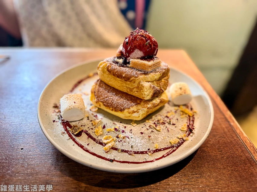 ▲貝貝果果舒芙蕾鬆餅 220元:舒芙蕾鬆餅是周末假日限定,盤上使用棉花糖、碎餅乾、莓果醬裝飾,兩塊舒芙蕾鬆餅上下堆疊,再放上一塊餅乾和草莓冰淇淋,最後淋上莓果醬,舒芙蕾鬆餅口感鬆軟有層次,內層吃得到鮮奶油內餡,奶香味與莓果香氣都很明顯,沒想到連甜點都有如此高的水準!