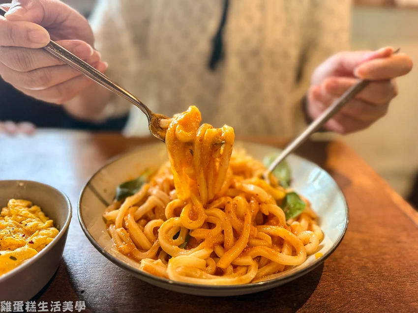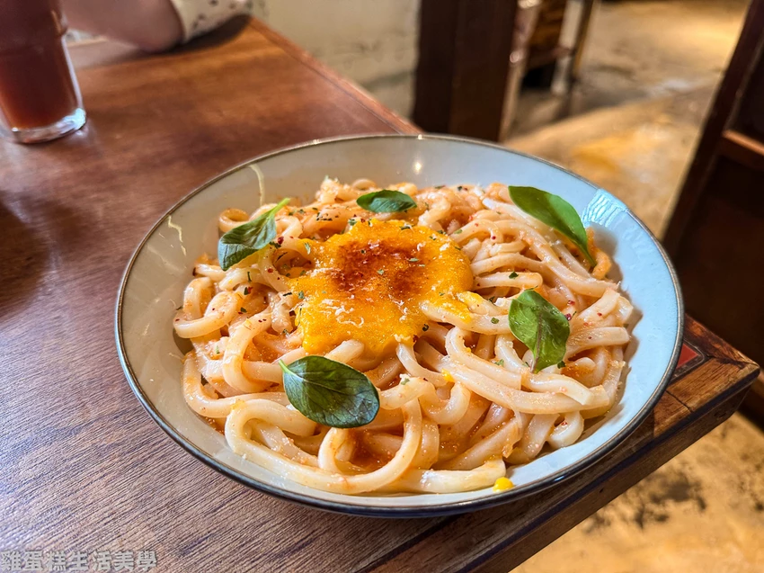▲烤布蕾鮭魚明太子烏龍麵 260元:麵體使用讚岐烏龍麵,口感Q彈滑順,醬汁內有滿滿的明太子、南瓜醬、碎鮭魚、泡菜,表層有一小塊烤焦糖,吃起來鹹鹹甜甜並帶有明太子醬的鮮美,非常夠味。