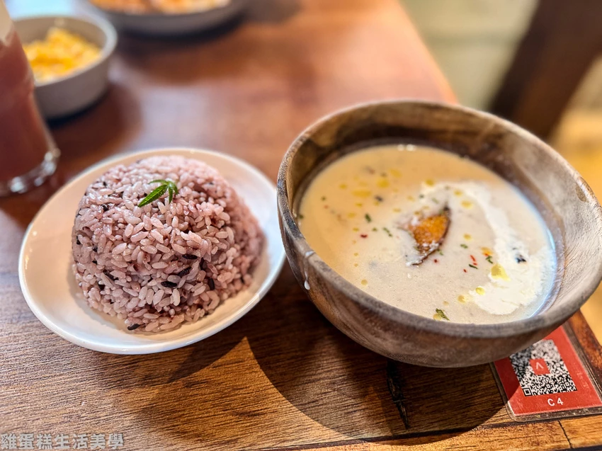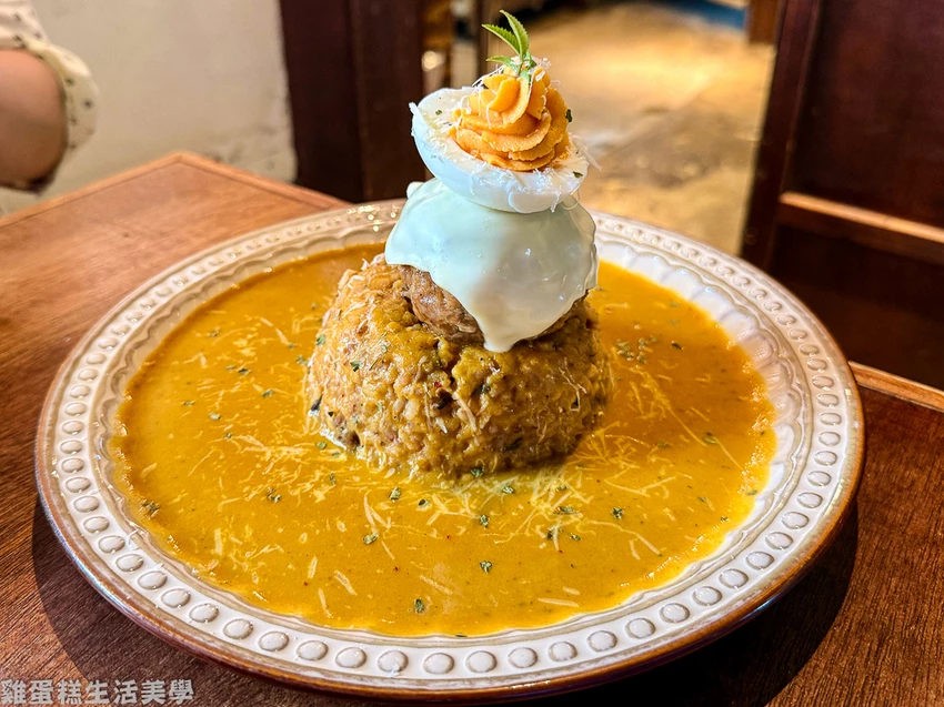 ▲山谷手打肉排南瓜咖哩 280元:主廚巧妙的將紫米飯、手打肉排、魔鬼蛋一層層做堆疊,擺盤有創意視覺效果極好,南瓜咖哩醬是中辣程度,可以吃得到南瓜纖維,加入鮮奶油後更加香濃,手打肉排使用台灣溫體豬製作並加入蘋果丁、洋蔥,再放上一片溶化的起司整個超香,魔鬼蛋是水煮蛋去掉蛋黃,再使用美乃滋、黃芥末擠上蛋黃的位置,製作過程繁瑣,根本是法式料理的級別。