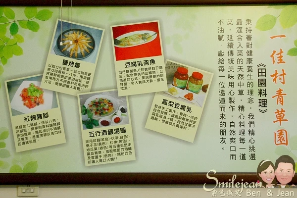 「一佳村養生餐廳」把藥用植物帶入養生料理中,在沒有污染沒有農藥與除草劑的青草園中,讓大家能夠享受大自然薰陶的同時並能品嘗五行五色的青草養生餐。