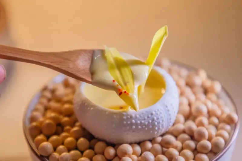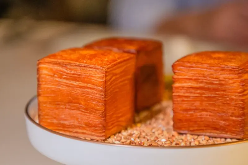 ▲▼酥脆層次分明的丹麥千層麵包,抹上鹹香白味噌與微辣艾斯佩雷辣椒醬,風味濃烈又平衡。