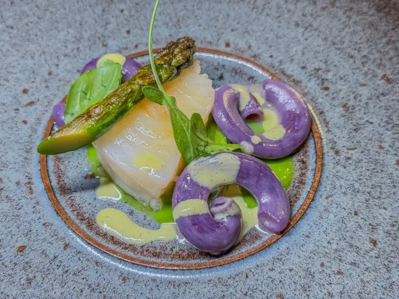 ▲圓鱈肉質細緻柔嫩,佐以嫩綠蘆筍與形如漩渦的特製義大利麵,宛如海浪的意象躍然盤上。