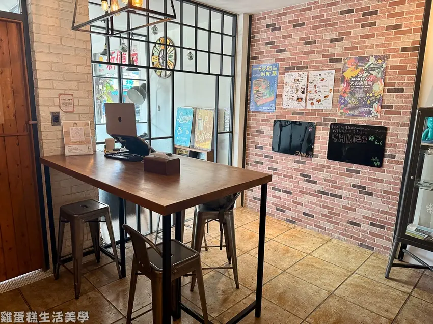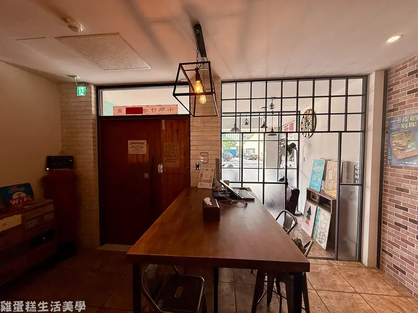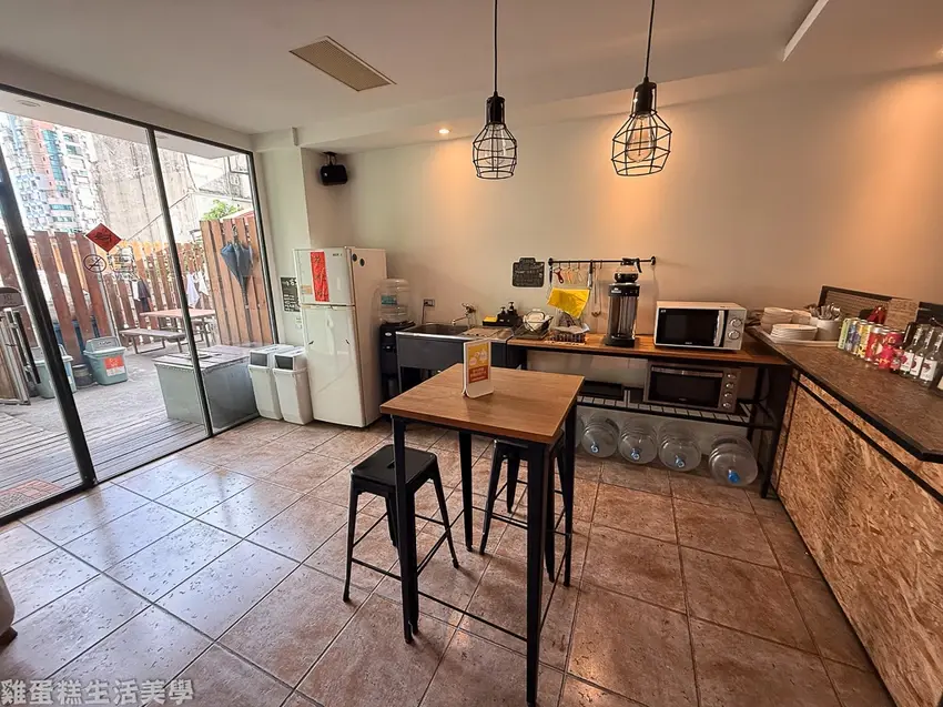 ▲一樓公共空間有吧檯和沙發休息區,裝潢使用文化石搭配工業風的家具。