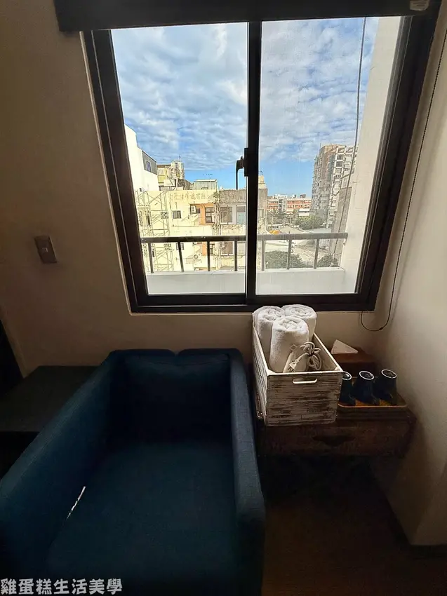▲窗邊有一個藍色小沙發,沙發旁有提供毛巾、水杯、吹風機、衛生紙。