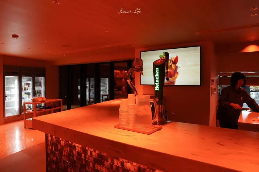 到了晚上,大廳的燈光打上紅色的氛圍,讓你好像走進LOUNGE BAR一樣
