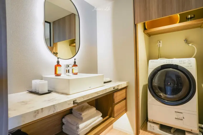 還有更扯的是,洗手台一旁的櫥櫃打開居然有個洗烘衣機