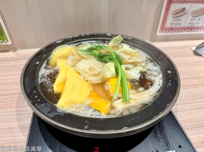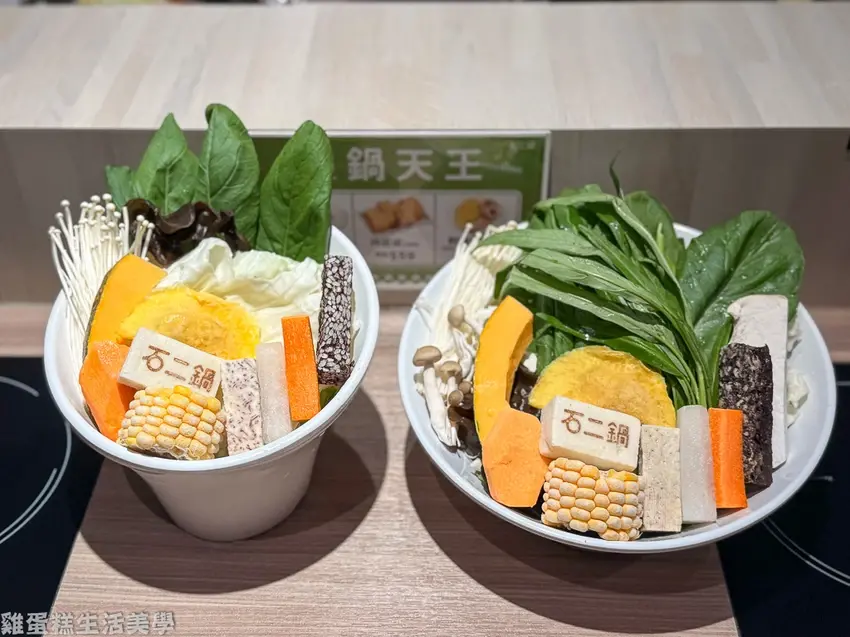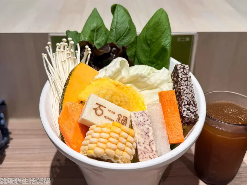 ▲石頭鍋(愛呷肉):菜盤內有兩樣青菜、木耳、金針菇、南瓜、玉米、豆腐、芋頭、紅白蘿蔔、豬血糕、蛋餃,種類很多元。