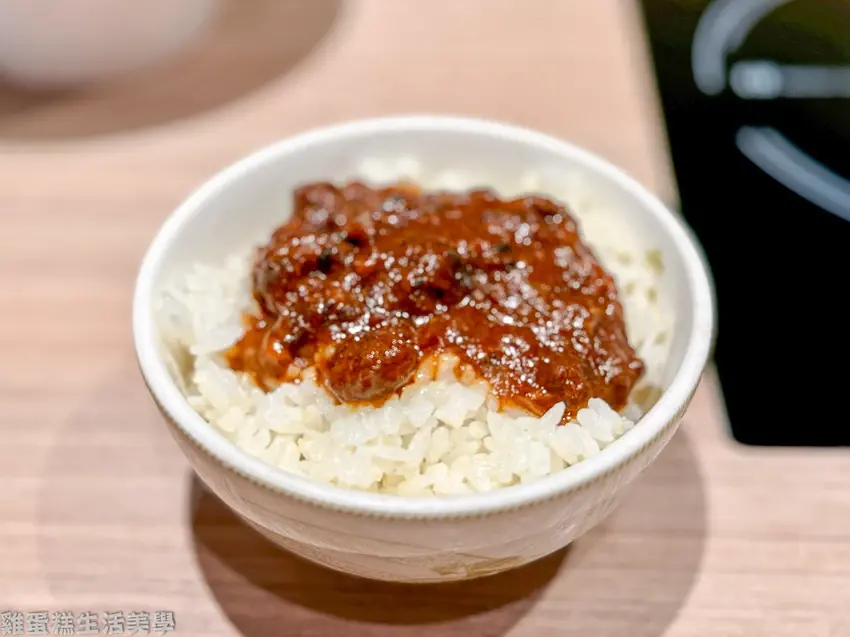 ▲滷肉飯 +13元:附餐加13元白飯可升級成滷肉飯,滷肉飯淋上了滿滿一層肉醬,肉醬是全瘦的絞肉,醬汁相當夠味很下飯。