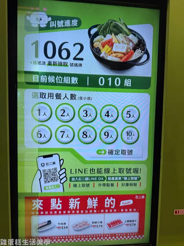 ▲抵達後至大螢幕選擇用餐人數,上面也會同時顯示候位人數,拿取號碼牌等候叫號。