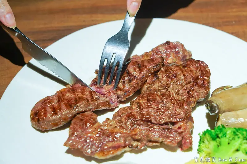 切開後,肉品內部呈現迷人的粉紅色澤。入口時,除了感受到炭烤帶來的香氣,紐約客特有的紮實嚼勁與飽滿肉汁。真的愈嚼愈香。