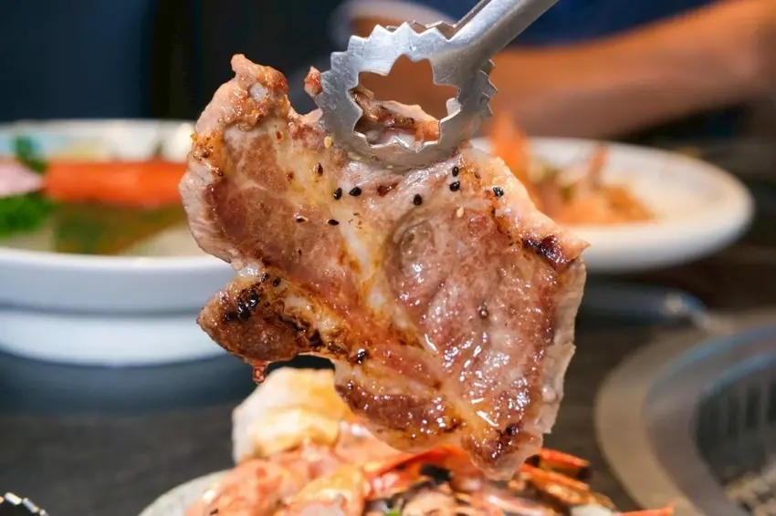 ▼分量十足的伊比利沙朗給了兩大塊,厚切烤起來外脆內嫩,咬下去滿嘴肉汁,隨著咀嚼越能感受到牛肉香!