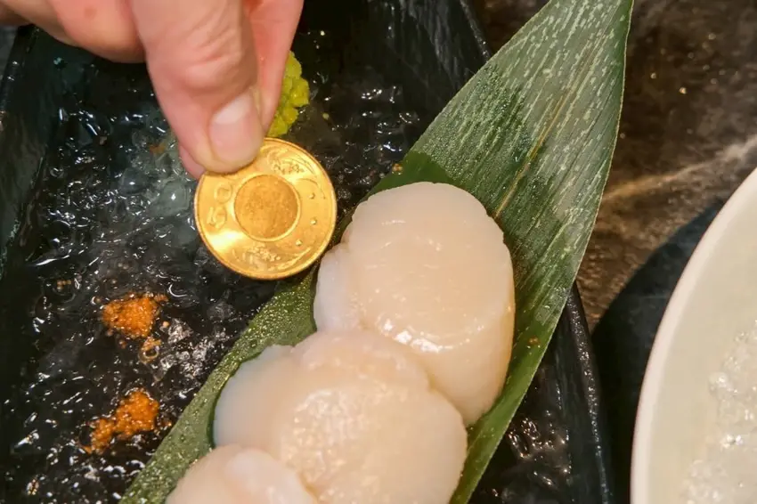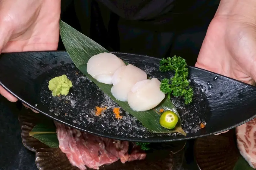 ▼生食等級的北海道干貝刺身,稍微烤一下就可以享用,口感有夠嫩,咬下去整個干貝的甜味炸開,超頂!