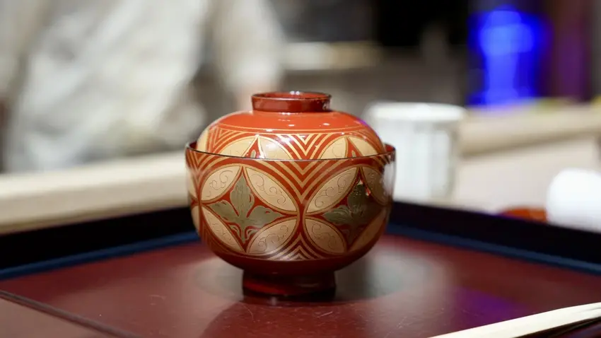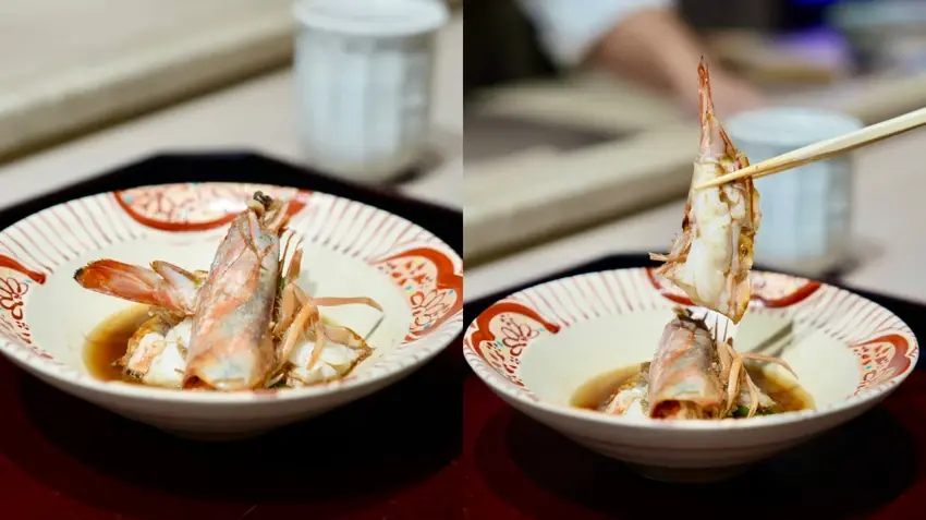 下一道是煮物料理:具足煮,這是一種日本的傳統料理方式,通常會以甲殼類海鮮放入高湯中熬煮,今天的海鮮是「車蝦」,蝦肉口感脆彈,保留海鮮的鮮甜海味,湯頭都是蝦膏和甲殼精華,很濃郁很好喝。
