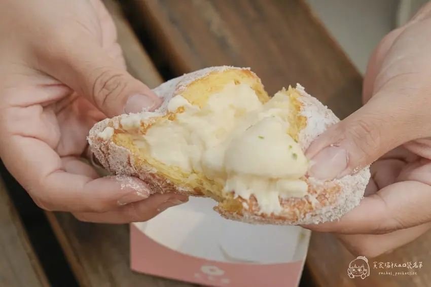 這家生甜甜圈的麵皮口感介於 I’m donut 的濕軟與 Daykey donut 的較紮實口感之間,是一種軟中帶Q,而且外層帶有微微脆感的口感,應該蠻符合大部份台灣人的口味。麵皮厚度剛剛好,內餡也恰到好處,不會滿到太膩口。不過,每款甜甜圈外層都有再灑上糖粉,如果內餡甜度較高,糖粉可能會有點搶戲。