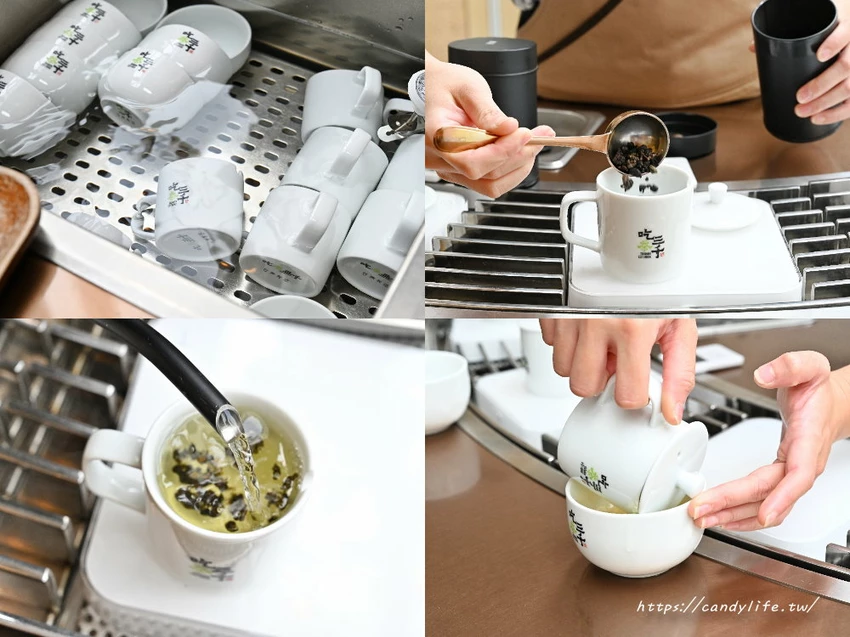 在等待茶飲的同時,不妨走到一旁的 梨山烏龍茶品鑑區,體驗一場由職人茶師親自演繹的沖茶展演。這裡提供六款來自梨山的烏龍茶,皆由吃茶三千以獨家技法烘焙出不同層次的色澤與香氣。每一杯現烘茶都遵循國際茶葉品評的黃金比例—以3克茶葉、95度熱水、靜置6分鐘的完美步驟沖泡,充分展現茶葉最純粹的風味