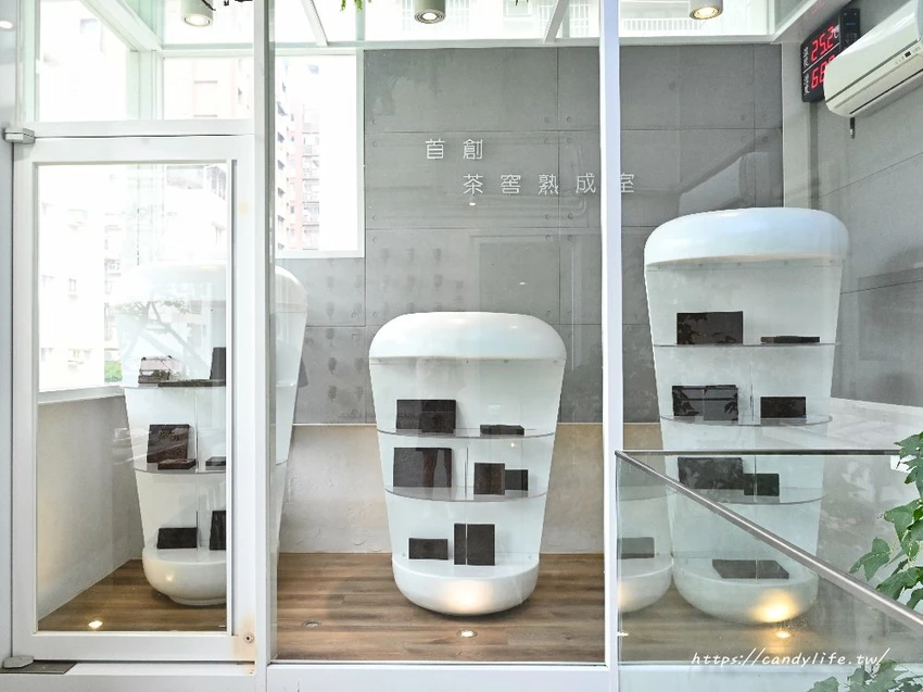 來到三樓,這裡是吃茶三千世界首創的「茶窖熟成室」。室內陳列著整排烏龍茶磚,這座茶窖以精密的溫控與濕度系統,模擬出「一天如一年四季」的自然變化,讓茶葉在穩定的環境中緩緩熟成,風味也隨時間推移而更加圓潤、深邃。這不只是技術的展現,更是一場時間與茶的對話