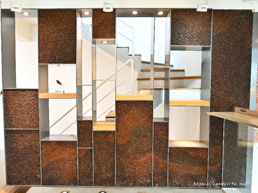 另一側的茶牆也相當吸睛,整面牆以梨山烏龍茶葉為素材,依照不同茶葉的色澤手工拼貼出層層疊疊的山景,宛如將茶園風光搬進室內。走近細看,茶葉的質感清晰可見,空氣中還瀰漫著一絲淡淡茶香,讓人彷彿置身於山林之間,感受到茶的靜謐與自然氣息