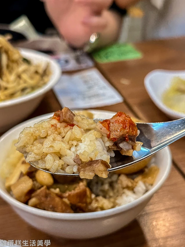 ▲滷肉飯45元+ 滷蛋15元:魯肉飯配菜是筍乾,滷蛋是另外加點,魯肉肥瘦各半,醬汁鹹香感明顯,並加了些辣椒醬提味,如果有小朋友要吃須提醒不要加辣。