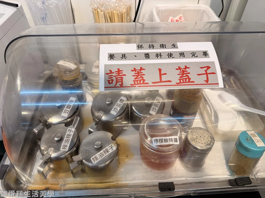 ▲自助區提供餐具和各式醬料,餐具皆使用消毒器消毒過,醬料也罩在蓋子內,這種重視衛生的店家不多了。