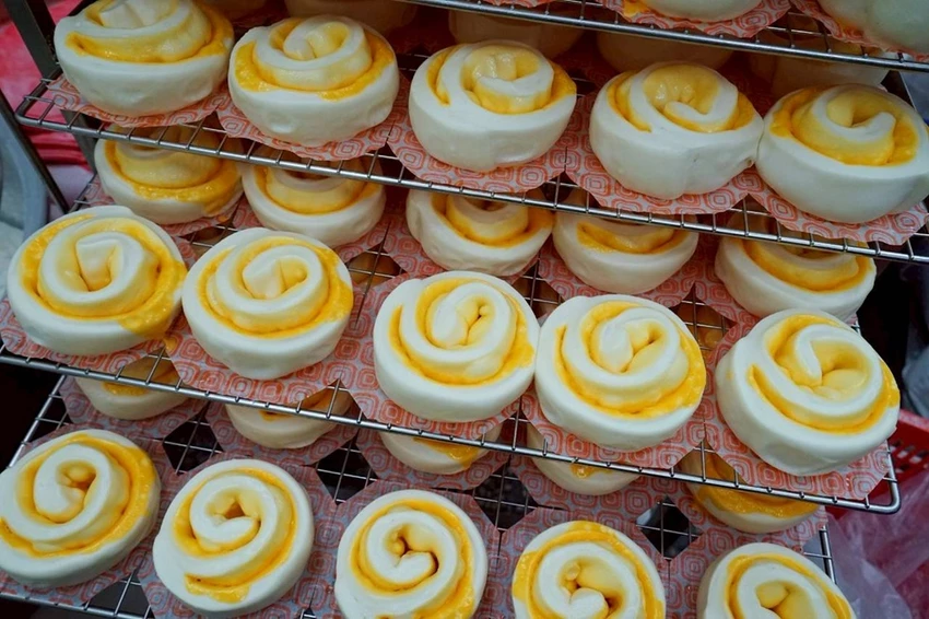 一層層的起司捲更是引人注目,中央以螺旋狀盤繞而上的濃郁黃色起司餡。每一顆的紋理都清晰可見,彷彿一層層捲起來的小太陽。視覺上充滿了奶香和起司的鹹香風味,令人垂涎。