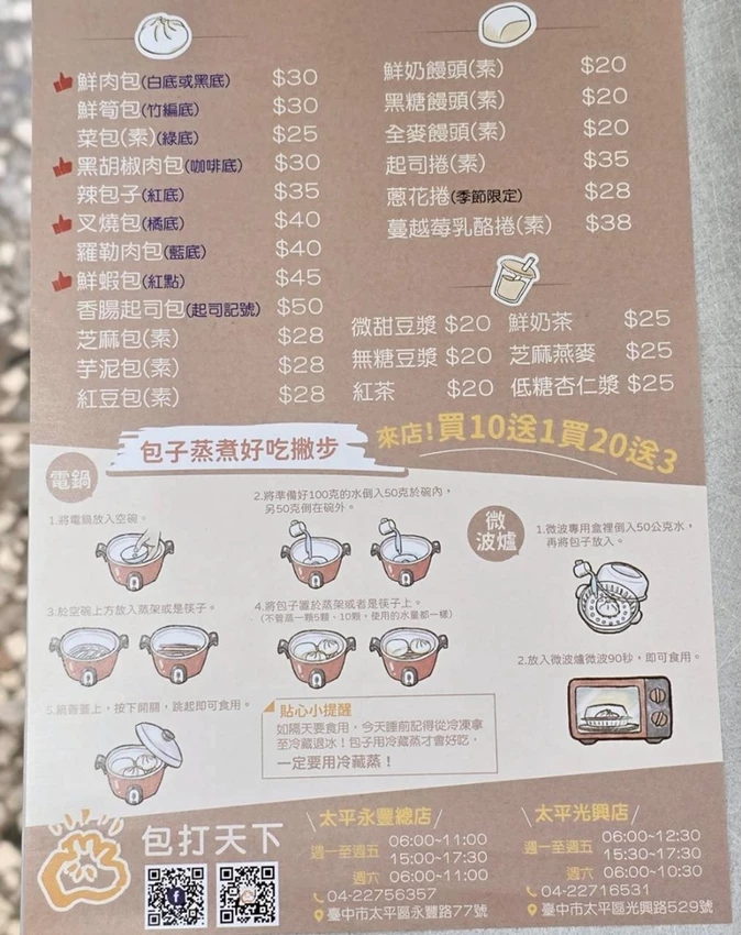 更令人期待的是——包打天下即將迎來第三家分店開幕!看得出來在地人氣真的很穩,如果你跟小涼一樣是「看到蓬蓬白白的包子就會忍不住想咬一口」的那種人,把太平店直接收進口袋名單準沒錯。