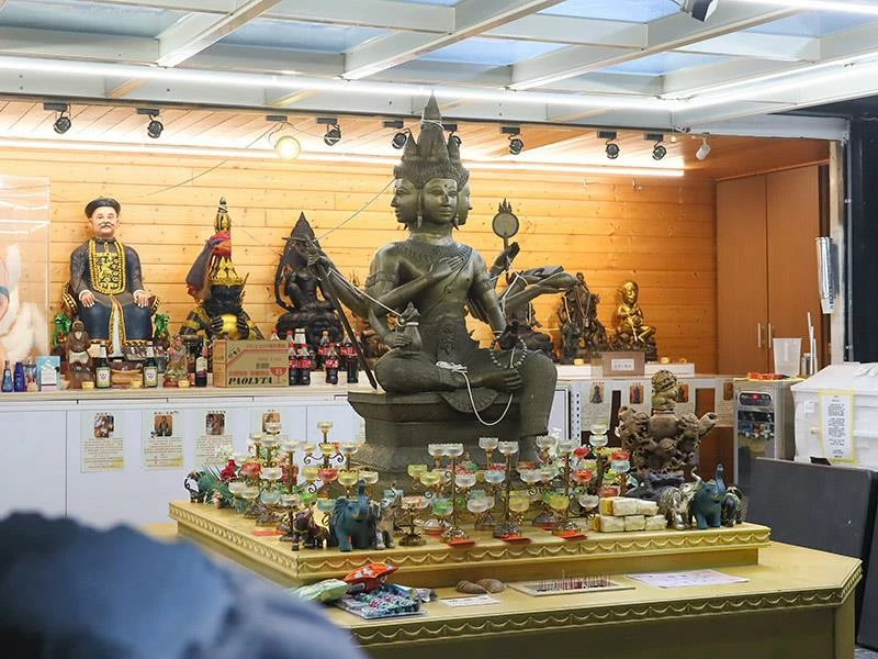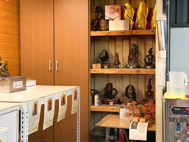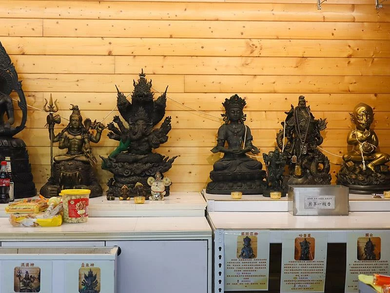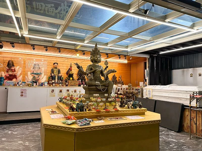 佛殿中供奉著全台少見的雙四面佛,一尊在外、一尊在內,氣勢既壯觀又祥和。如果到訪,也可以詢問老闆關於「狐仙姊妹來台」的故事,背後其實十分動人。殿內另供奉徐祝老人、泰國賭神二哥豐、招財女神、拉胡、澤度金、濕婆神、象神等來自泰國與民間信仰的神佛,每一尊神像下方都貼有對應故事與緣由介紹,讓人不會對陌生信仰感到距離,反而能更理解這些神祇背後的文化意涵。