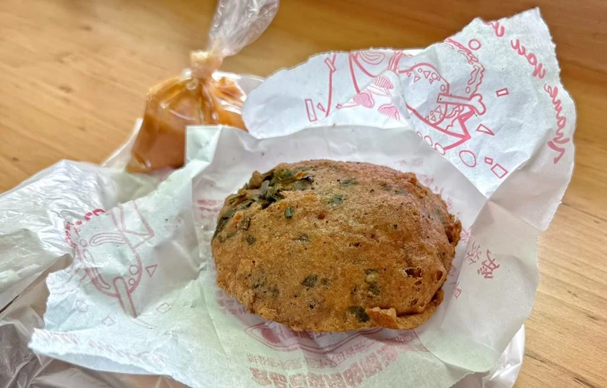 楊記蔥油餅是許多后里人下午固定會買的點心。口味從原味到蒜泥都有,但沒有辣味版本(可以跟店家要辣椒包)。整張蔥油餅會切成八塊外帶,香氣十足但口感不算酥脆,是屬於耐吃型。