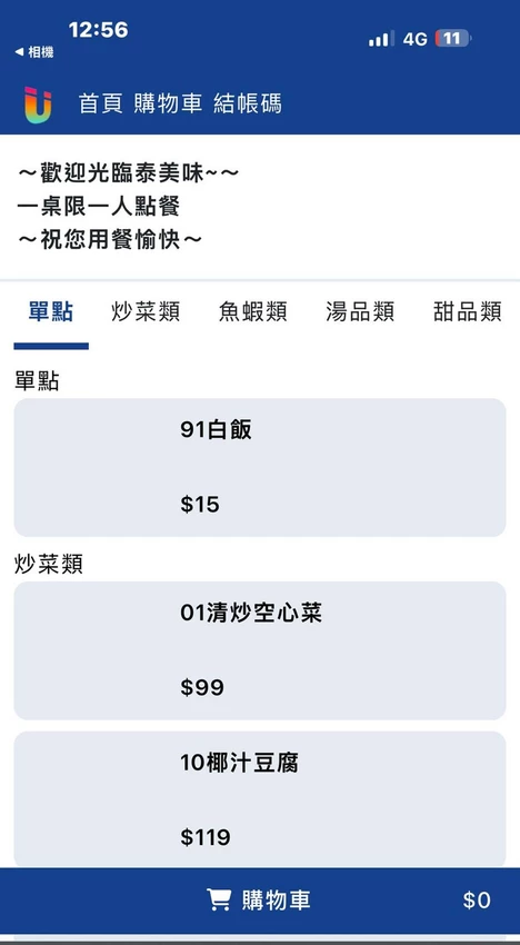 泰美味提供簡單明瞭的菜單,主要以泰式與雲南家常料理為主。假日不提供簡餐,因此所有品項皆以單點為主。點餐流程為掃碼 → 加入購物車 → 櫃台現金結帳,操作直觀,整體流程順暢。店內沒有提供紙本菜單,第一次來可能會不小心點比較多,但若吃不完可以到櫃台旁自行索取紙袋或塑膠袋自行打包。
