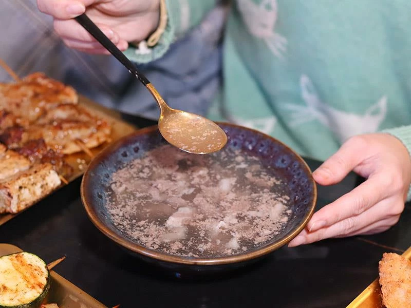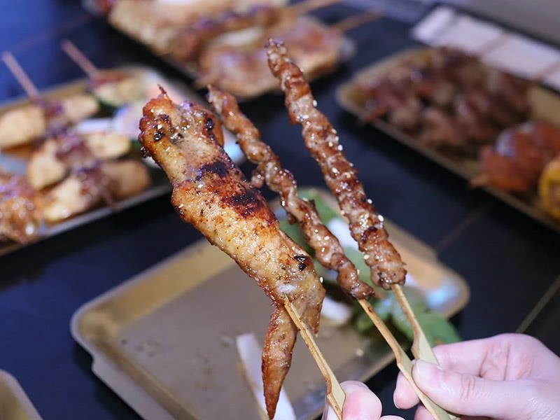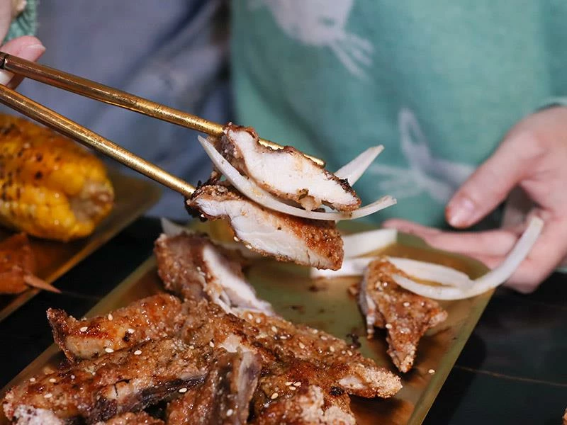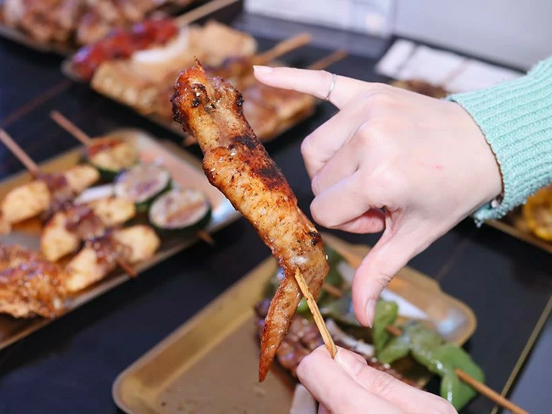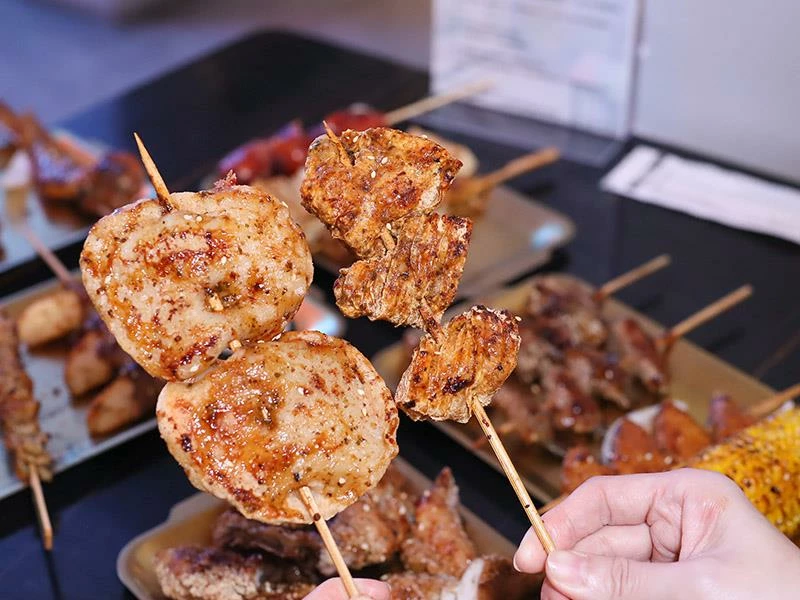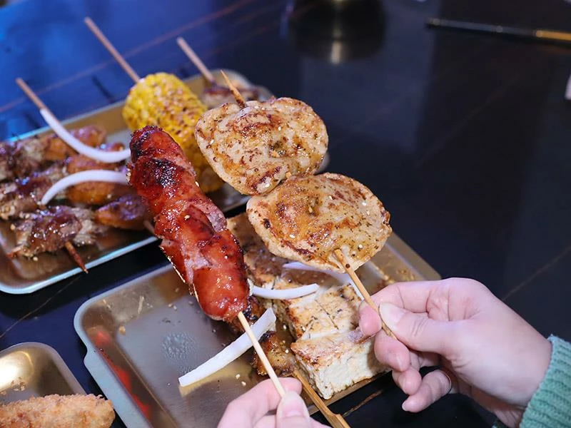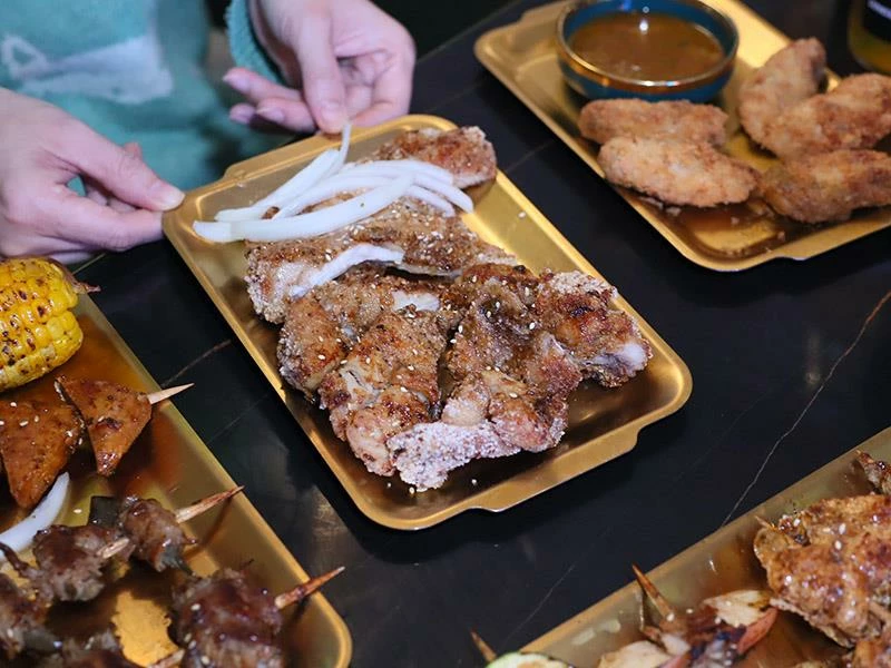 店家採「先炸後烤」方式鎖住肉汁,再刷上特製醬料、以木炭炭烤收香。手工香腸比一般尺寸更大,外酥內嫩、咬下肉汁直流;雞翅串厚實飽滿、雞皮串酥脆香潤;豬梅花帶筋越嚼越香;剝皮辣椒豬微辣勁道十足;蘋果豬清甜爽口;金針豬咬下會有蔬菜水嫩感,層次豐富。再加上炭烤雞排香氣四溢、洋蔥增香不油膩,是店內人氣主餐。