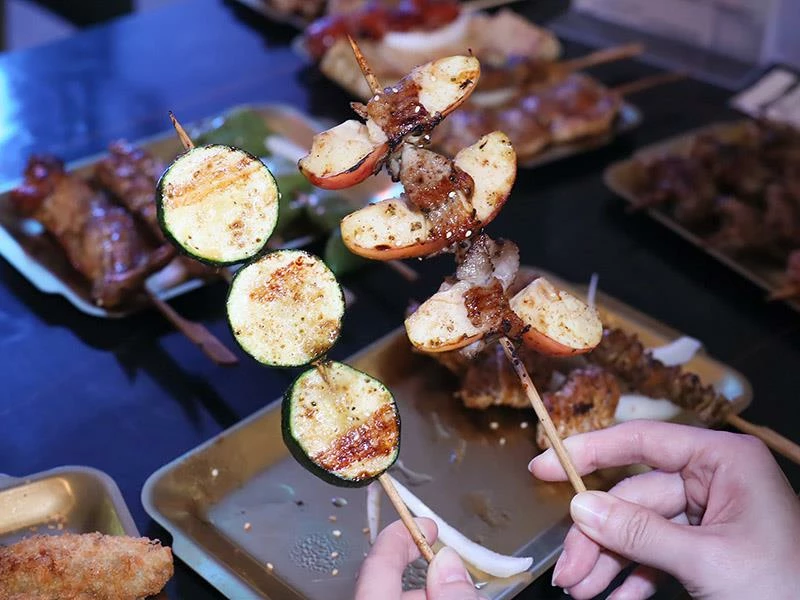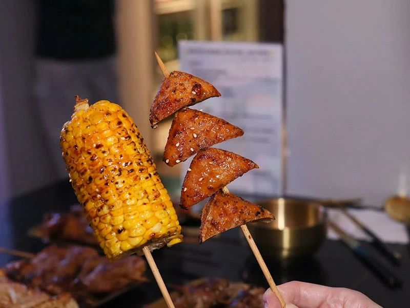 蔬菜串也是亮點,青椒微焦帶甜、櫛瓜多汁爽脆、玉米保留甜味、豆包酥香到誇張、豆乾與百頁片大厚實,刷醬後風味更加鮮明,是很適合與肉串搭配的品項。