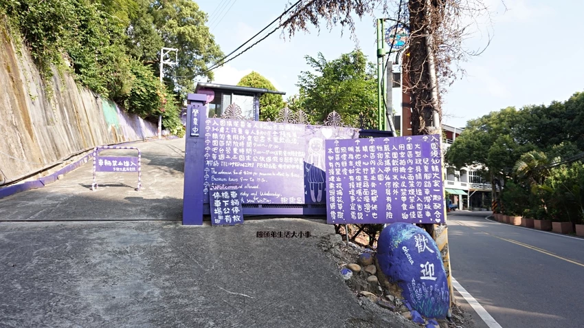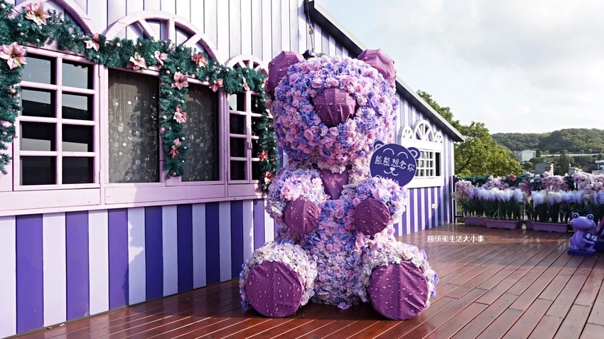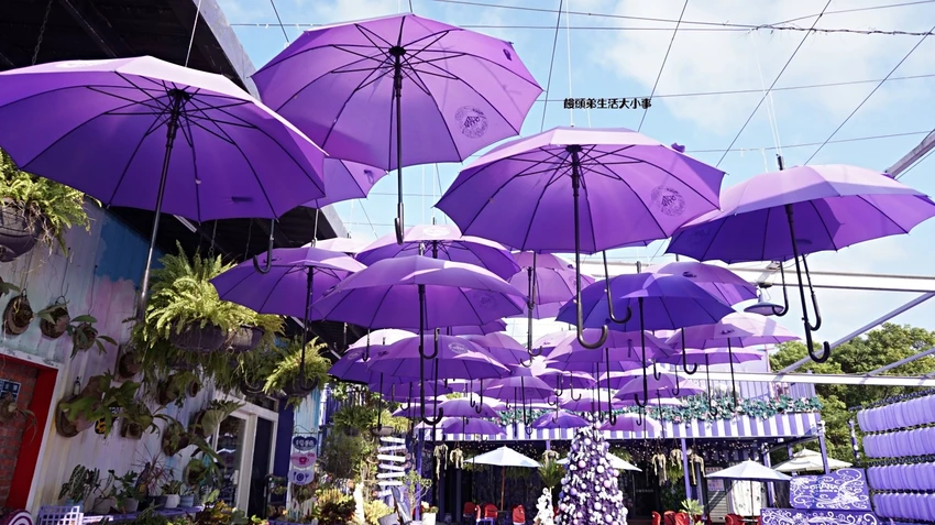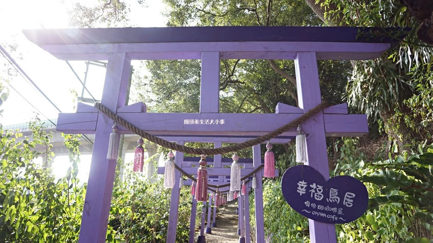 沿路便能看到醒目的紫色招牌,步入園區後大片紫色景觀立刻吸引視線。日式雨傘搭配小熊擺飾是必拍亮點,紫色鳥居拍起來更增添奇幻氛圍。園內多處景點分布在步道兩側,都讓旅人拍不停。