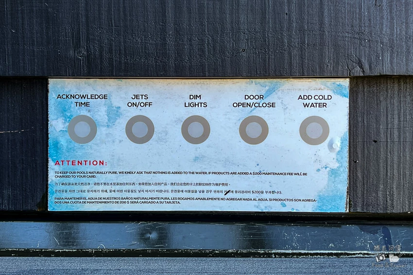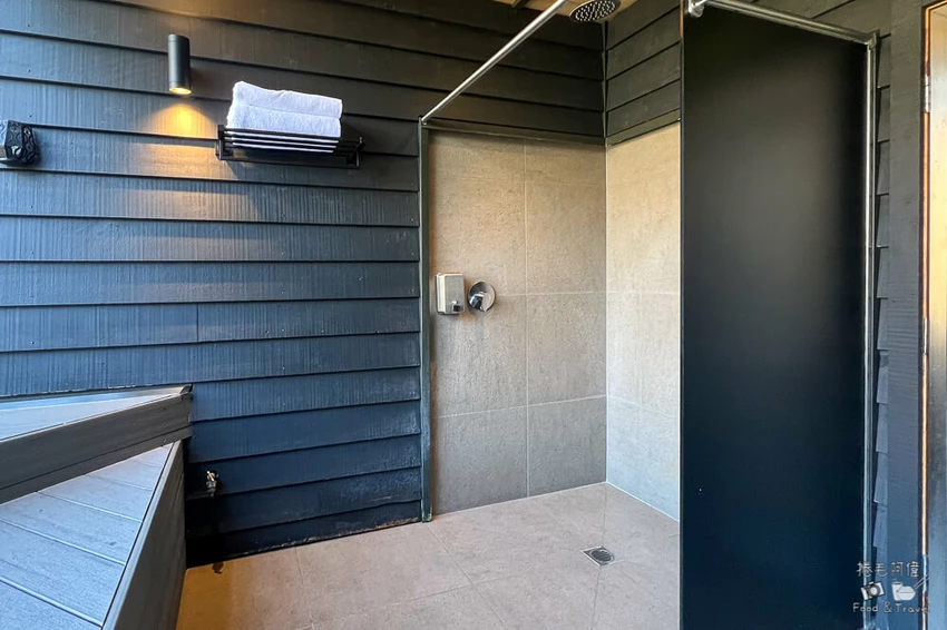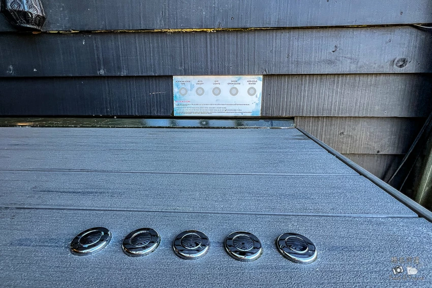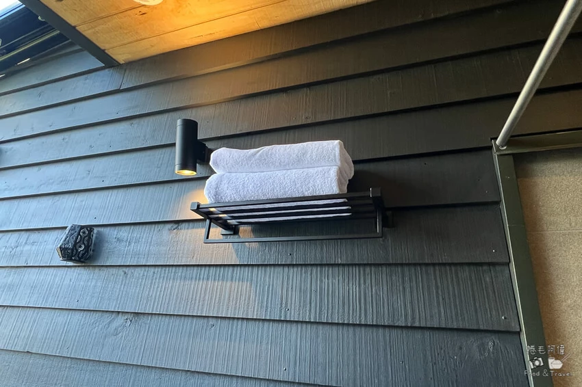 湯屋以木質調為主體,空間乾淨舒適。左側設有置物架與衣物掛勾,另一側則是簡潔的淋浴間,建議旅客自備盥洗用品,以便提升使用習慣的舒適度。大浴巾整齊地放置在架上,方便泡湯後使用。池邊的按鈕能控制燈光、窗戶開合、遮雨棚與池水按摩模式,只需簡單操作便能調整最適合的泡湯氛圍。夜幕降臨後,湯池邊的柔光亮起,玻璃外的山色沉入夜色,峽谷間只剩溫泉蒸汽緩緩升起,是皇后鎮最浪漫的片刻。