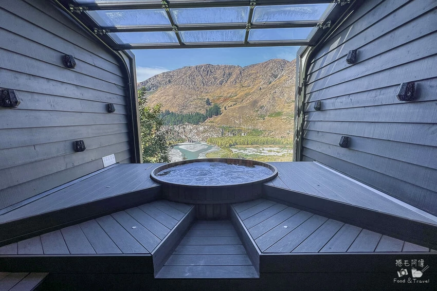 皇后鎮溫泉是當地最受歡迎的私人湯屋體驗,整排湯池以木質建築串起,彷彿懸掛在 Shotover 河峽谷之上。每間湯屋皆採用全景玻璃窗設計,只要按下按鈕,整面窗便會滑開,山景、河谷與風聲瞬間引入室內,讓旅客在三十七至三十九度的天然加熱泉水中徹底放鬆,這份沉浸式的體驗也讓皇后鎮溫泉被稱為紐西蘭最美的私人湯屋之一。