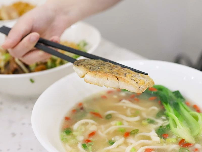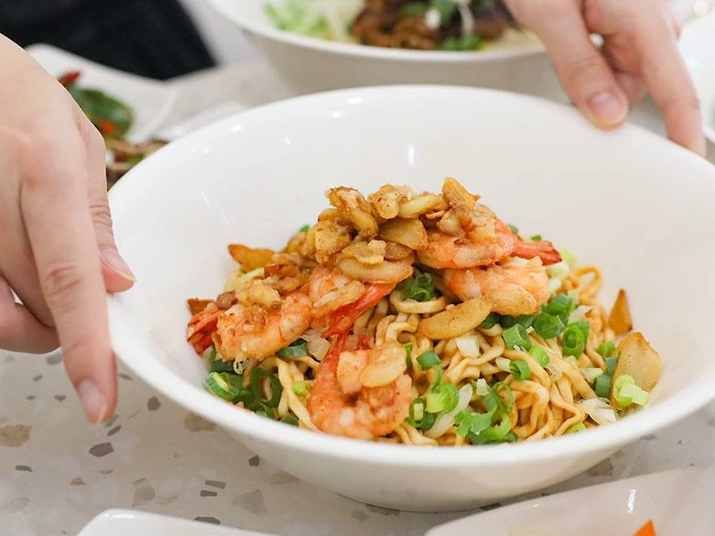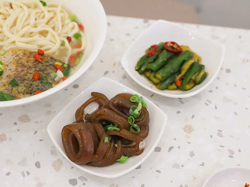 「蒜是很蝦」是招牌必點,用蝦頭與蒜頭熬成的蝦頭蒜醬比油封蝦還濃郁,麵條吸附醬汁後整碗香得不得了,蝦子還貼心去殼,是把法式煉醬硬是拉進台式麵裡的創意。小菜搭配木耳與花生,若加套餐老闆還會幫忙直接算便宜的組合價。「真的很鱸」則是一大塊鱸魚躺在湯裡,湯頭用馬賽魚湯的做法熬煮,枸杞提升甜味,喝起來溫潤又暖胃。鱸魚肉質細嫩,當午餐有種小奢華的感覺,吃起來完全不像只要一百多元的價格。