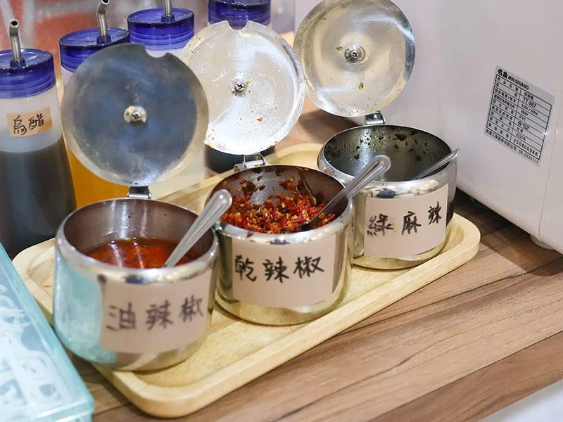 前方的自助飲料與醬料檯,是上班族最愛的細節。店內的辣椒是老闆自己做的,紅辣椒香濃帶勁、混小魚後辣度直接跳起來;綠麻辣則是老闆請四川師傅特調,麻得乾淨、尾韻舒服,很容易一吃上癮。飲料喝到飽更是園區人最有感的小幸福,忙到沒空喝水的日子來這裡特別補回來。