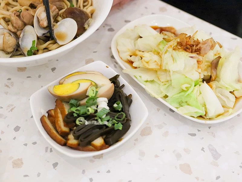「蛤蜊蒜是雞」的雞湯是用黑蒜頭熬的,一喝就知道不是一般雞湯,溫順、香甜、深度足,再加上蛤蜊整個鮮味往上拉。雞肉給得多又嫩,是那種忙到崩潰時喝一口就覺得世界變比較好的湯。套餐的小菜也非常划算,$69 就能選冷菜、滷菜、燙青菜三樣,是園區人最愛的組合。炸肉單點也值得試,皮薄脆、不油膩、香氣清爽,很適合搭麵或直接當小點。鶴夾麵整體吃起來沒有花俏噱頭,卻在每一個細節都看得出誠意。園區午餐、晚餐不知道吃什麼時,走進這裡通常都能被一碗麵治癒。