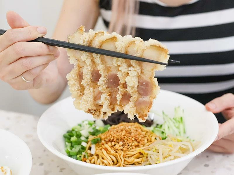 「有肉的麻麻辣辣」香味厚實,豆芽、小黃瓜、木耳、花生碎、青蔥全部拌開後層次爆炸,麻香、脆感與花生的香氣一次到位。旁邊配的炸肉也是自家製作,醃料、切肉、炸法全自己來,連豬都是老闆同學家裡養的,炸皮白皙不油,夾生菜絲超順口。「炙燒狠牛」的牛肉用壽喜燒的方式處理,出餐前再炙燒,油香在空氣裡立刻散開,洋蔥軟到入口即化,五花牛肉彈嫩有咬勁,是一碗會讓人忍不住加麵的乾麵。
