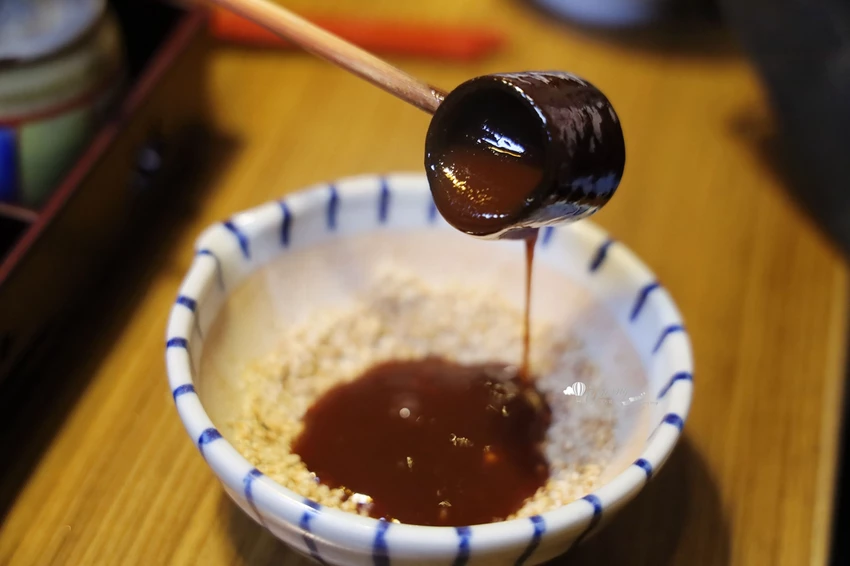 每桌提供研磨缽與山椒棒、金芝麻來自日本百年老店和田萬、輕搗即可散發濃郁香氣。搭配崎玉縣高橋醬料、辛口層次飽滿、甘口更甘醇、不會搶走豬排的甜味。這組沾醬與芝麻是勝政豬排的靈魂、也是許多客人一吃就回頭的理由。
